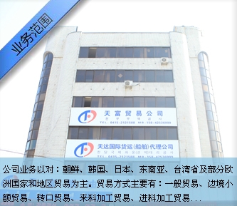 丹东天达国际货运代理有限公司是经原外经贸部批准的一级国际货运代理企业,公司成立于2000年,公司注册资本人民币500万元。2008年经国家交通部批准取得国际船舶代理资质。因此,天达货代是目前丹东地区唯一一家集国际货运代理、国际船舶代理于一体的综合性进出口代理企业。