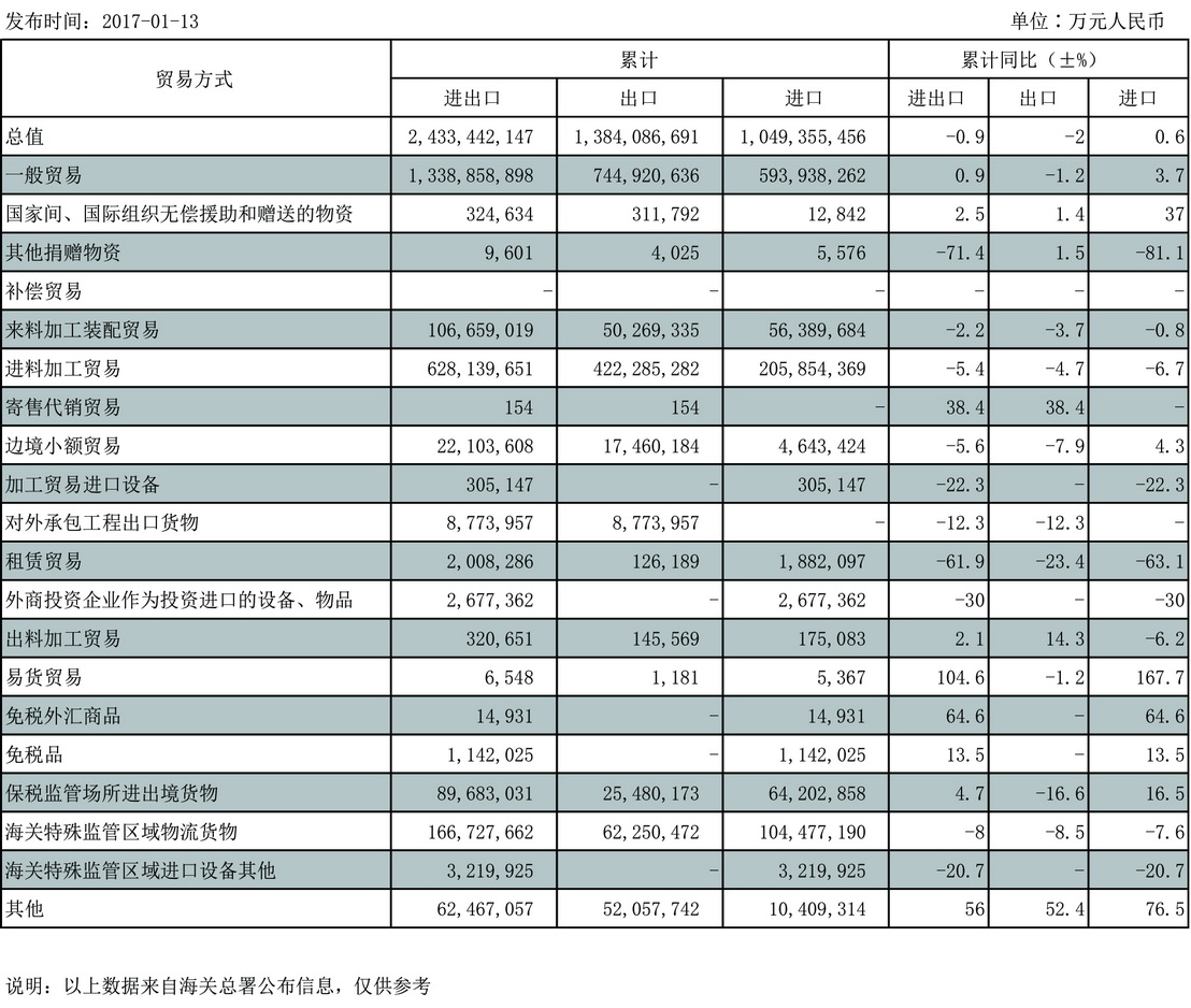 您当前的位置: 首页 > 进出口资讯 > 进出口数据 > (3)2016年12月进出口商品贸易方式总值表(累计)
